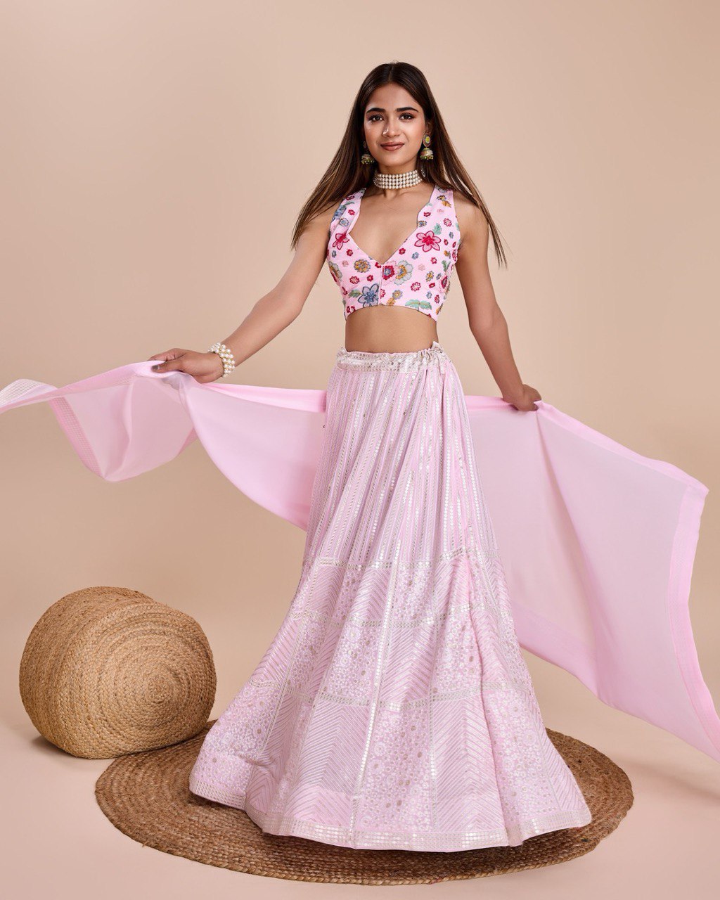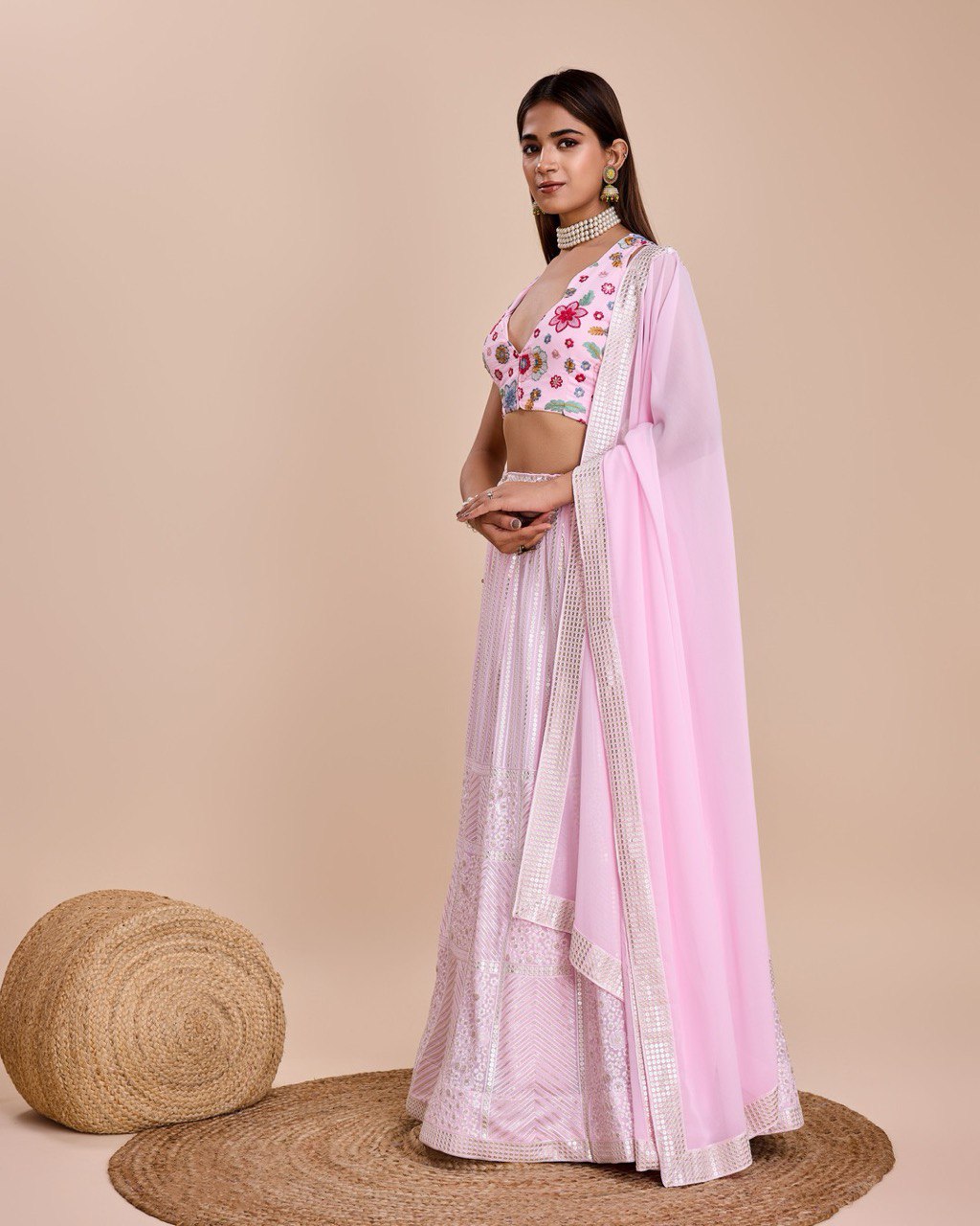 Embroidered Sequins Lehenga In Baby Pink Georgette With Choli And Dupatta Party Wear