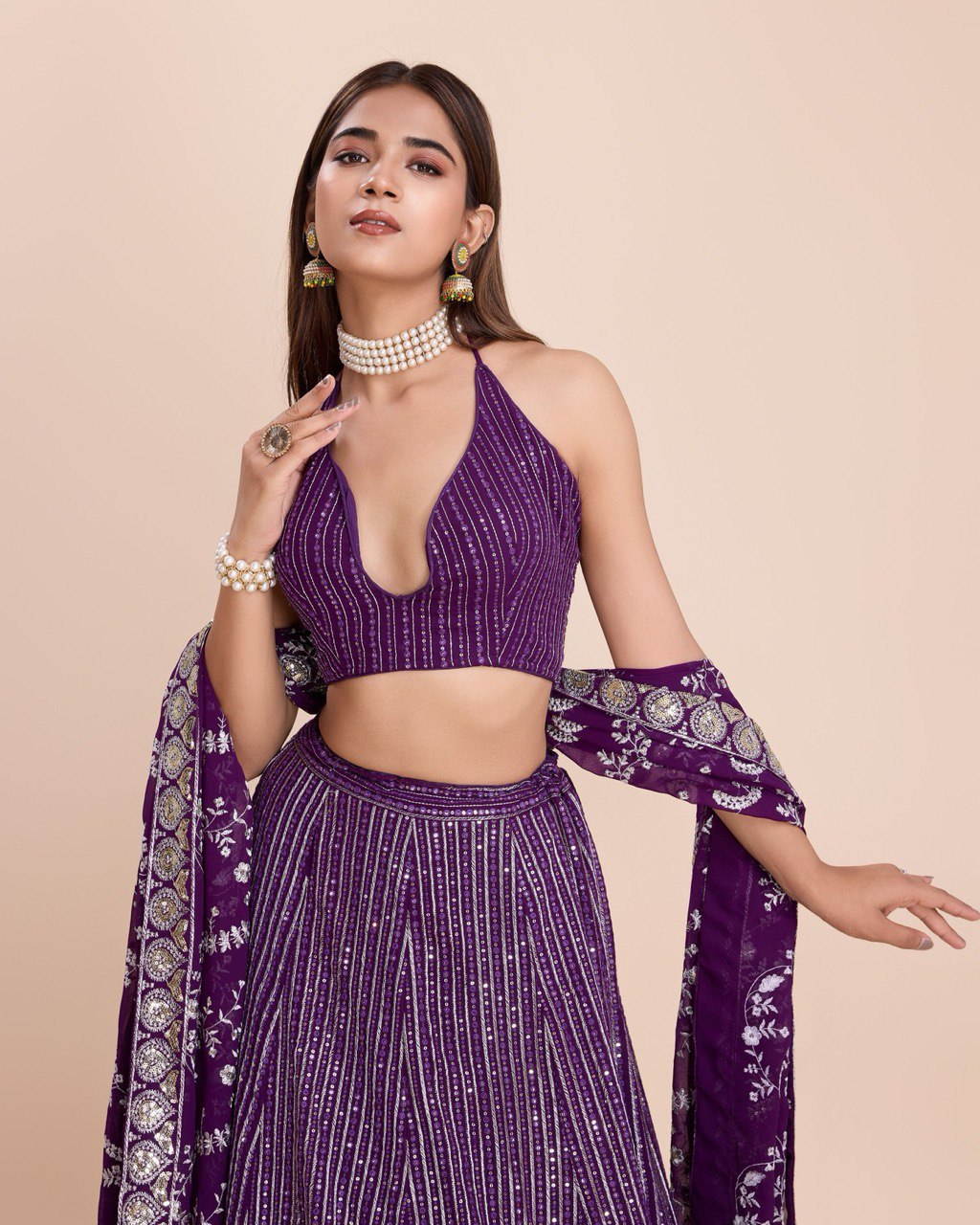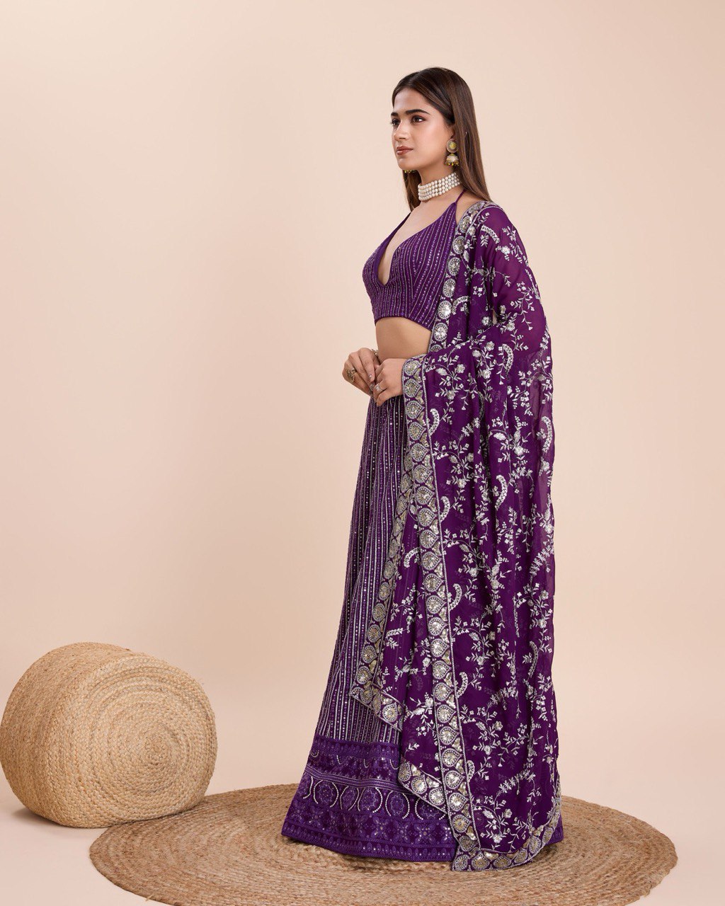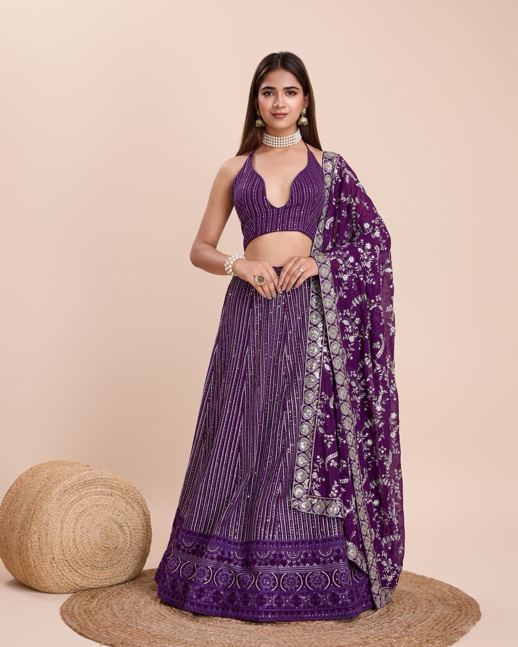 Wine Georgette Wedding A Line Lehenga Embroidered And Sequins Party Wear